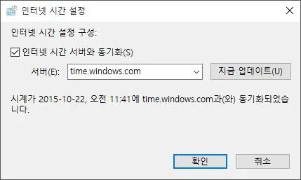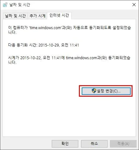 → 설정 변경 → 인터넷 시간 서버와 동기화 체크박스 체크