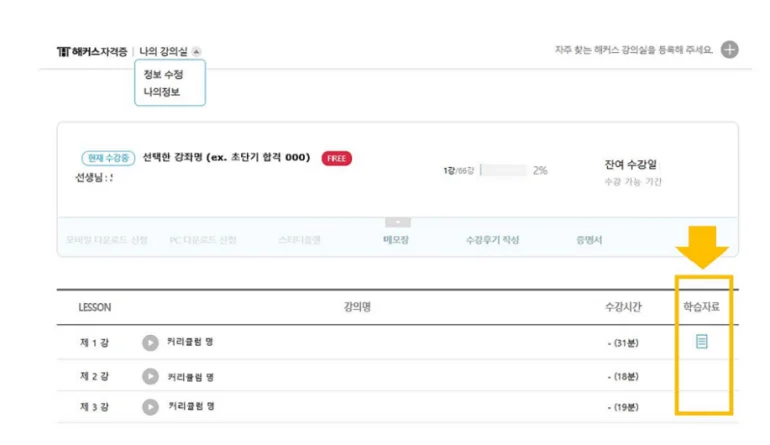 - 마이클래스 > 강좌 클릭 > PC 다운로드 클릭하시어 영상 다운로드 및 학습하실 수 있는 점 안내드립니다.