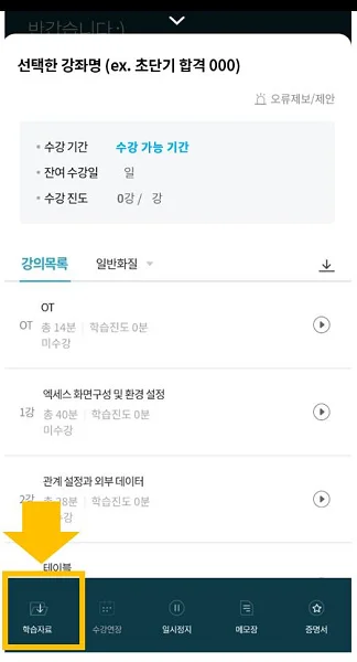 모바일 : 마이클래스 > 수강 강좌 클릭 > [왼쪽 하단 학습자료 다운로드 란]에서 다운로드 후 학습하실 수 있습니다.