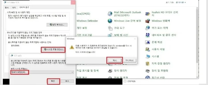 ⓐ 제어판 → 국가 또는 지역 → 관리자 옵션 → 시스템 로켈 변경 - 한국어(대한민국) 변경 후, 다시 재부팅