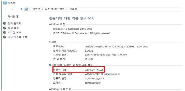 [경로] 제어판 → 시스템 및 보안 → 시스템 → 컴퓨터 이름/도메인 및 작업 그룹 설정 부분에 [컴퓨터 이름] 부분 확인